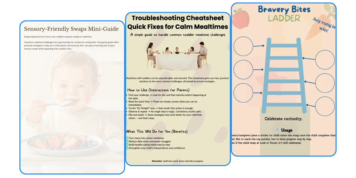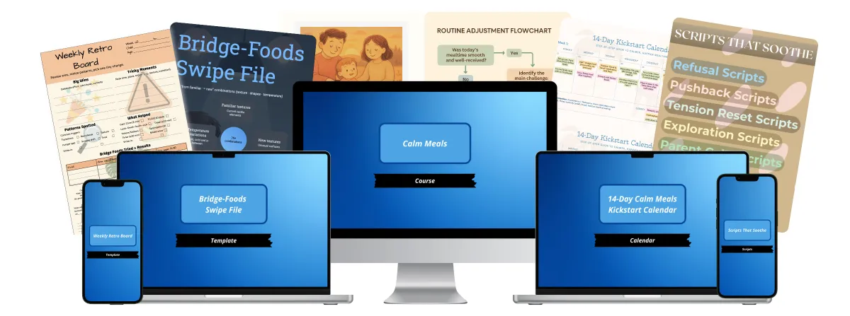 You’ll learn exactly how to set up your mealtime environment, use bridge foods to gently expand your child’s diet, and follow ready-to-print trackers and scripts that keep the whole family on the same page.