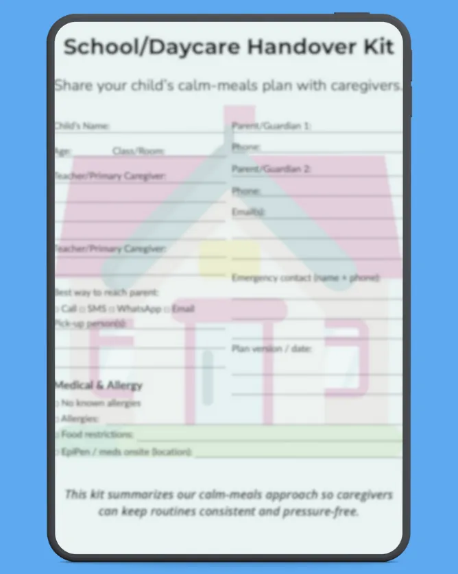 Make calm meals consistent everywhere. Share your child’s plan with teachers, daycare, or grandparents so mealtime routines don’t collapse the second you’re not there.