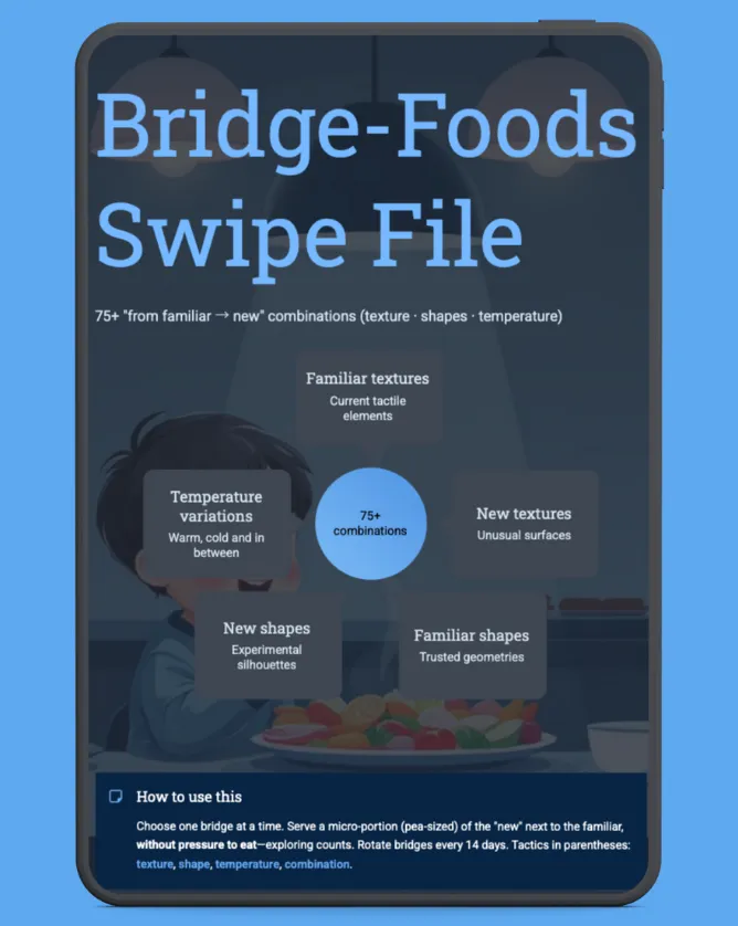 Bridge-Foods Framework: Learn how to use tiny sensory tweaks (texture, shape, temp) to gently move your child from “safe foods” to exploring new flavors, without meltdowns.