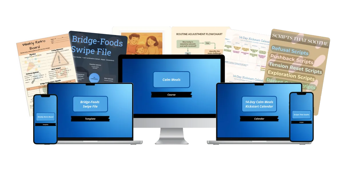 You get the complete Calm Meals System plus 9 powerful bonuses. This includes ready-to-print trackers and scripts, the 14-Day Kickstart Calendar, Calm Zone Setup Pack, Bridge-Foods Swipe File, Sticker Charts, Troubleshooting Cheatsheet, Sensory-Friendly Swaps, the Weekly Retro Board, and even a School/Daycare Handover Kit, everything you need to turn picky eating into calm, connected meals.