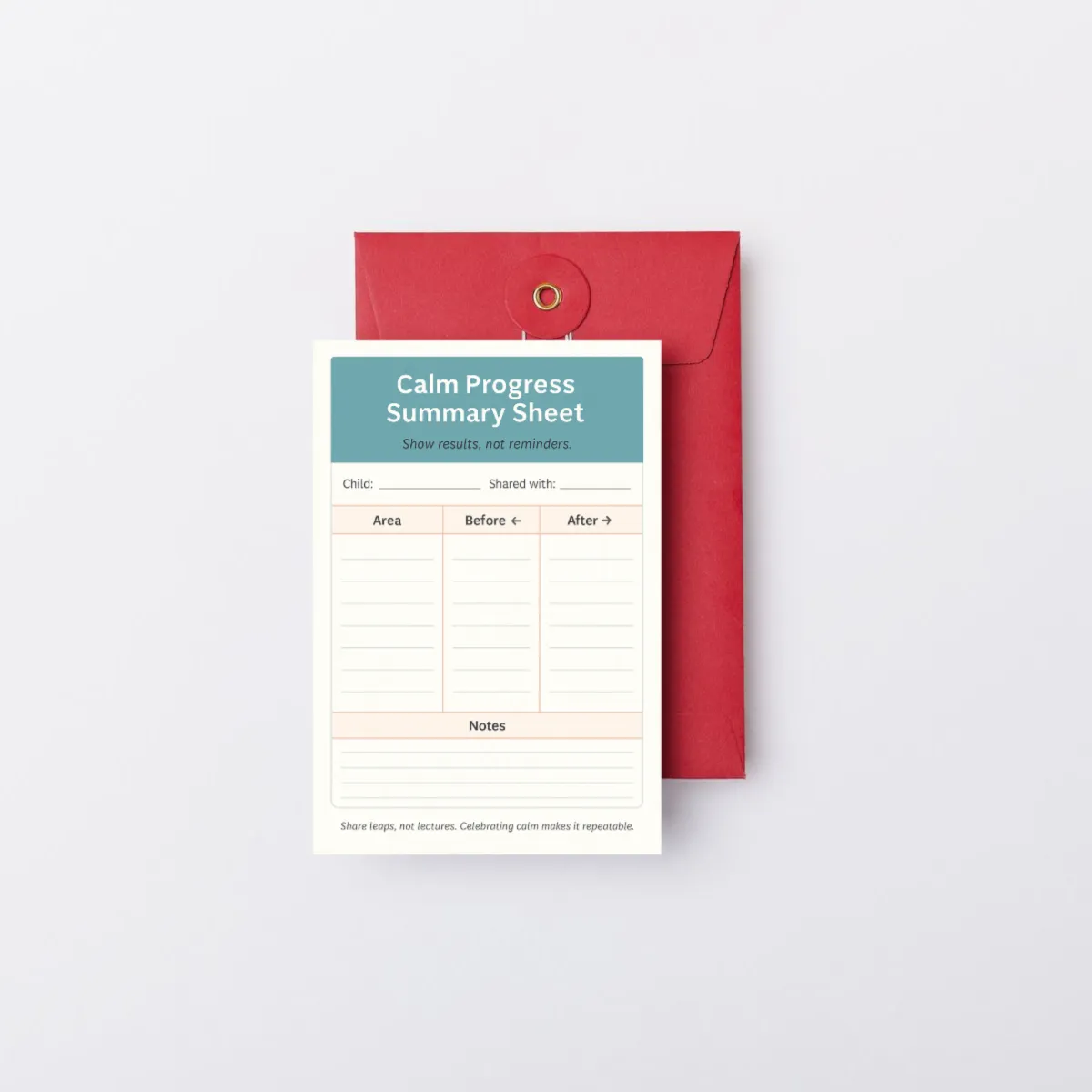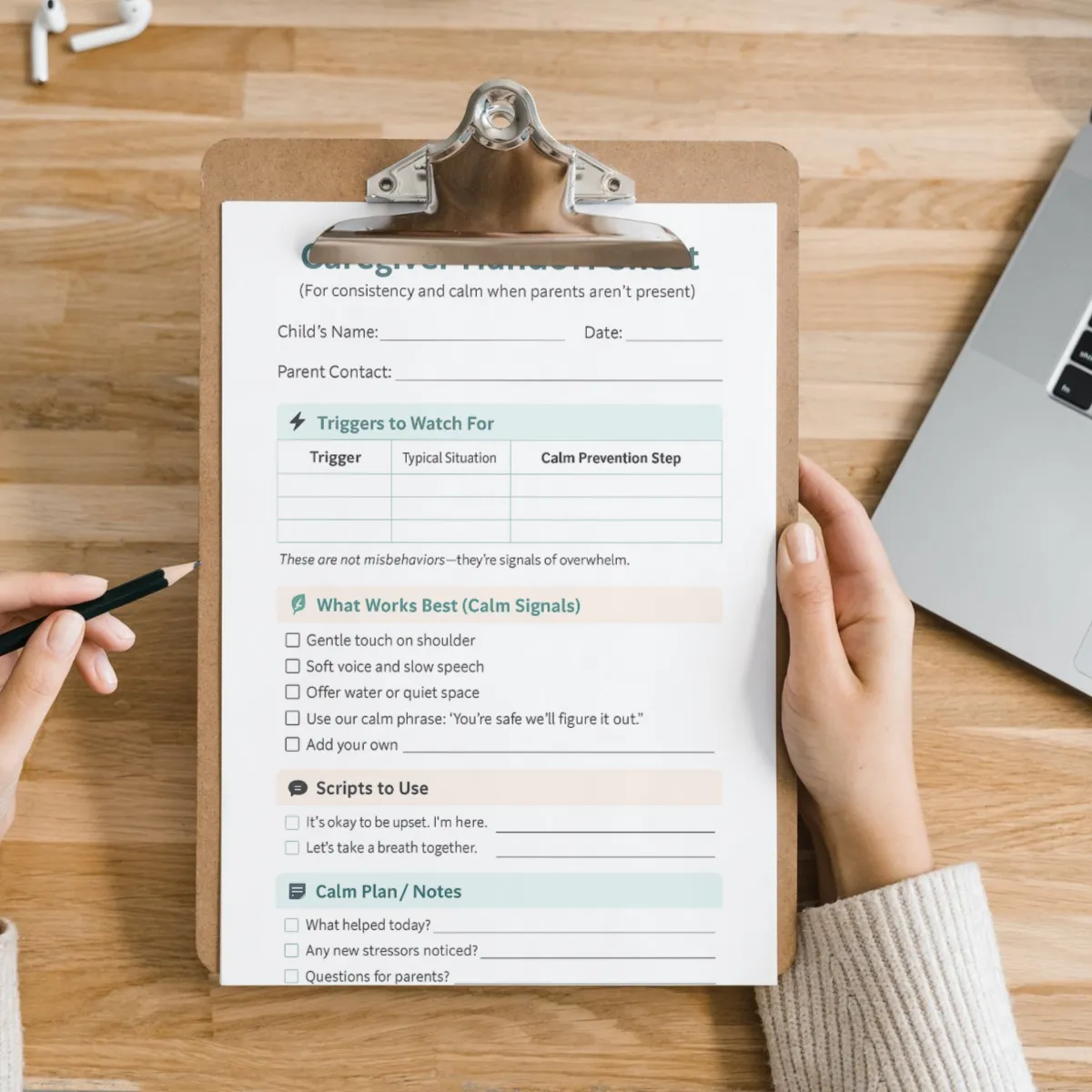 It helps, yes. That’s why you’ll get the Caregiver Handoff One-Pager, a simple summary anyone can follow to keep calm routines consistent across homes.
