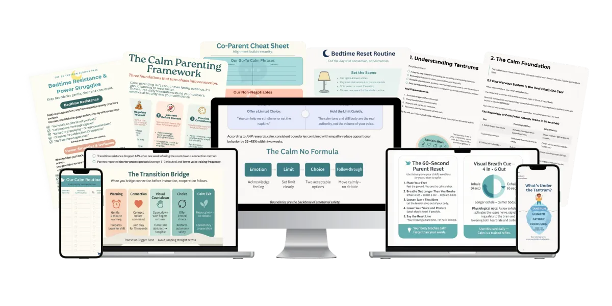 You’ll get step-by-step “in-the-moment” scripts that show you exactly what to say, how to respond, and how to help your toddler calm down fast, without yelling, threats, or bribes.